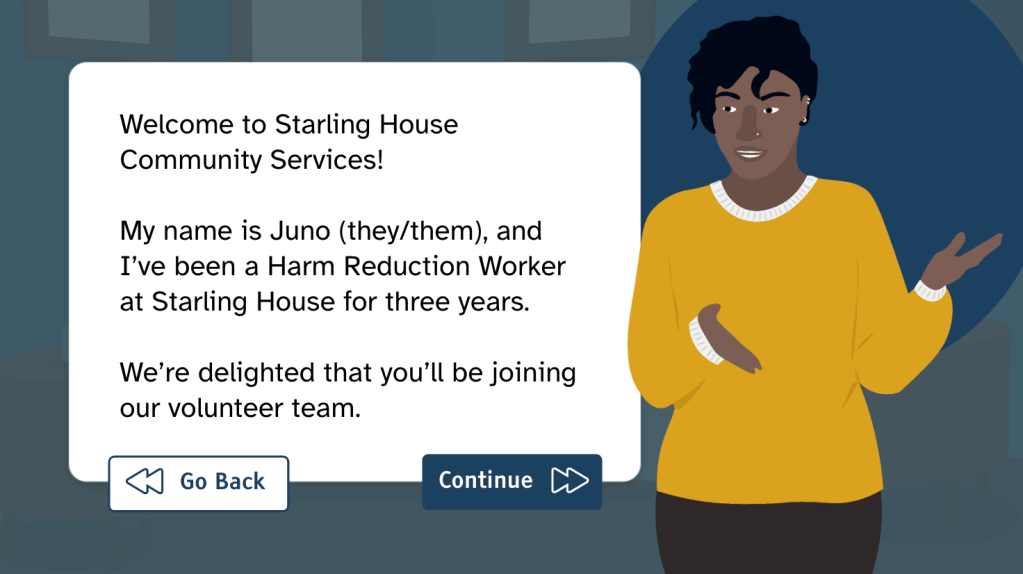 Given that most Canadians don’t know how to administer naloxone, Starling House wanted to supplement their in-person training so volunteers from any starting point could feel confident in their ability to respond to an opioid overdose. An online training component also eases some of the burdens on Starling House staff to provide exhaustive training in a single session.