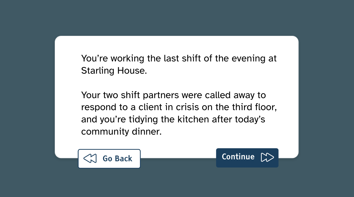 To complement and precede Starling House’s in-person orientation training, I developed a scenario-based e-learning experience that provides key background knowledge and guides learners through a simulated opioid overdose response. By practicing steps and skills in a risk-free virtual environment, learners can take the time they need to gain confidence and feel prepared to handle a similar situation in real life.