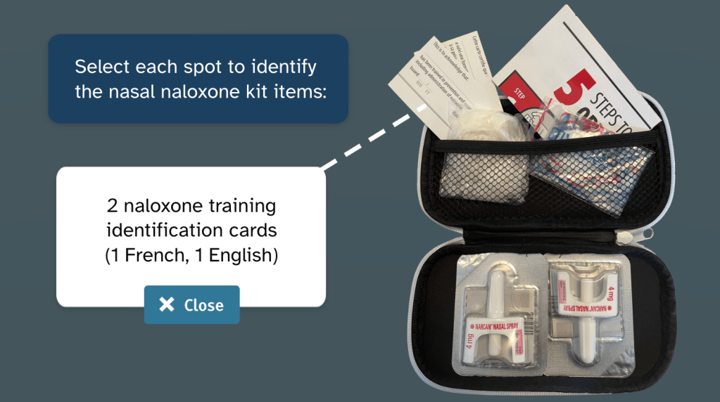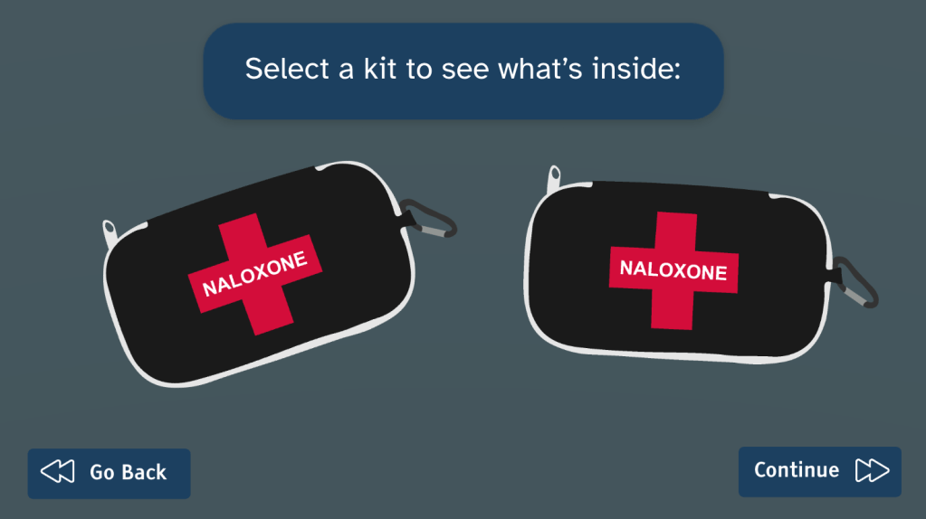 - Learners can choose which naloxone kit they want to use, placing them on a branching path to practice that route of administration. Learners can return to this selection point later if they want to try the other kit.