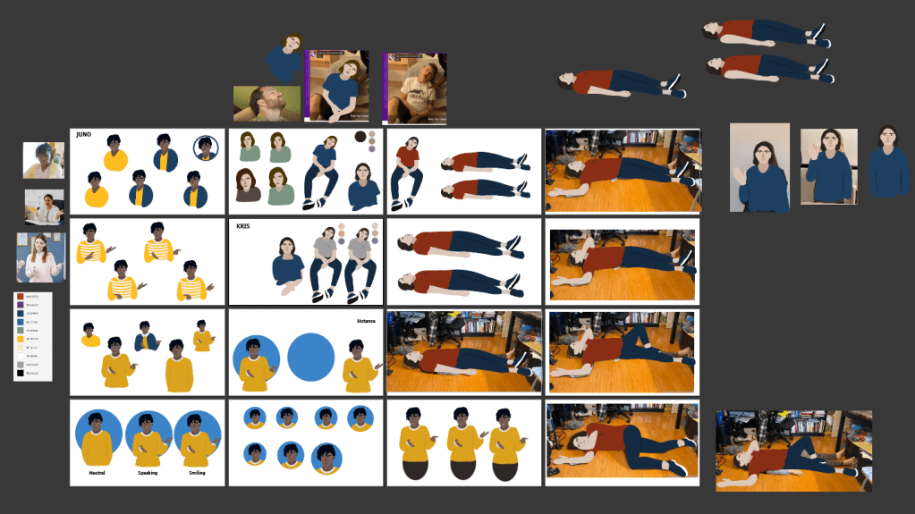 In Illustrator, I created two characters – Juno and Kris – and a range of poses and expressions for them that could shift dynamically throughout the course. I also drafted a background to represent a room at Starling House and created different variations to show distance. For navigation, I developed custom arrows for the main buttons and a custom mentor button that users could use to consult Juno.