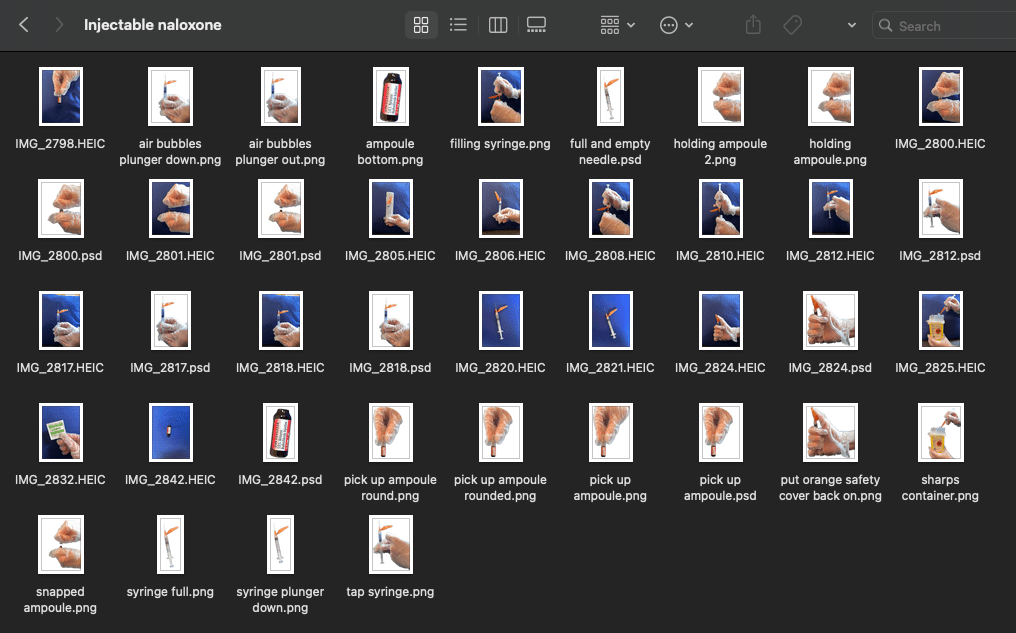 For the action images of naloxone administration, I used photos of my hands performing each step of the process. (I used expired kits so that no naloxone was wasted.) In Adobe Photoshop, I removed the backgrounds from the photos, adjusted their colours, and cropped them for the slides.