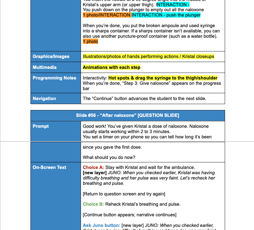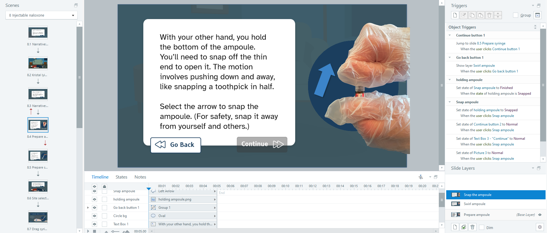 To address some limitations of existing in-person and online training, I wanted to make sure that the training was self-paced, repeatable, and meaningfully interactive to help users absorb and retain the information. Some virtual interactions allow for user choice, such as branching paths, and some reinforce physical actions, such as selecting arrows to prepare ampoules or dragging naloxone to appropriate sites of administration.