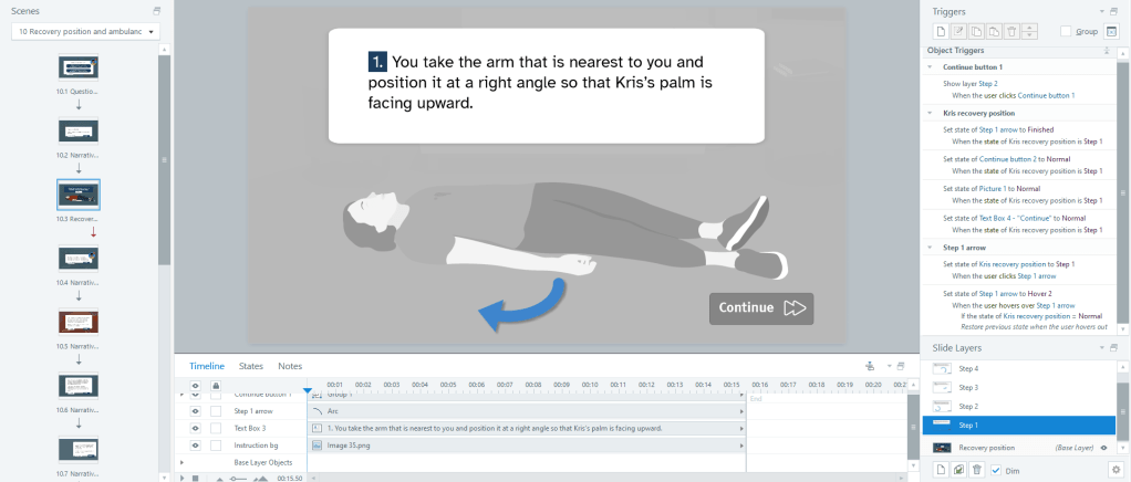 Once I had developed the slide mockups and assets, I put everything together in Storyline to build a course prototype. Working from my storyboard, I programmed animations, interactive object states, slide layers, branching paths, and drag-and-drop interactions that would engage learners and bring the scenario to life.