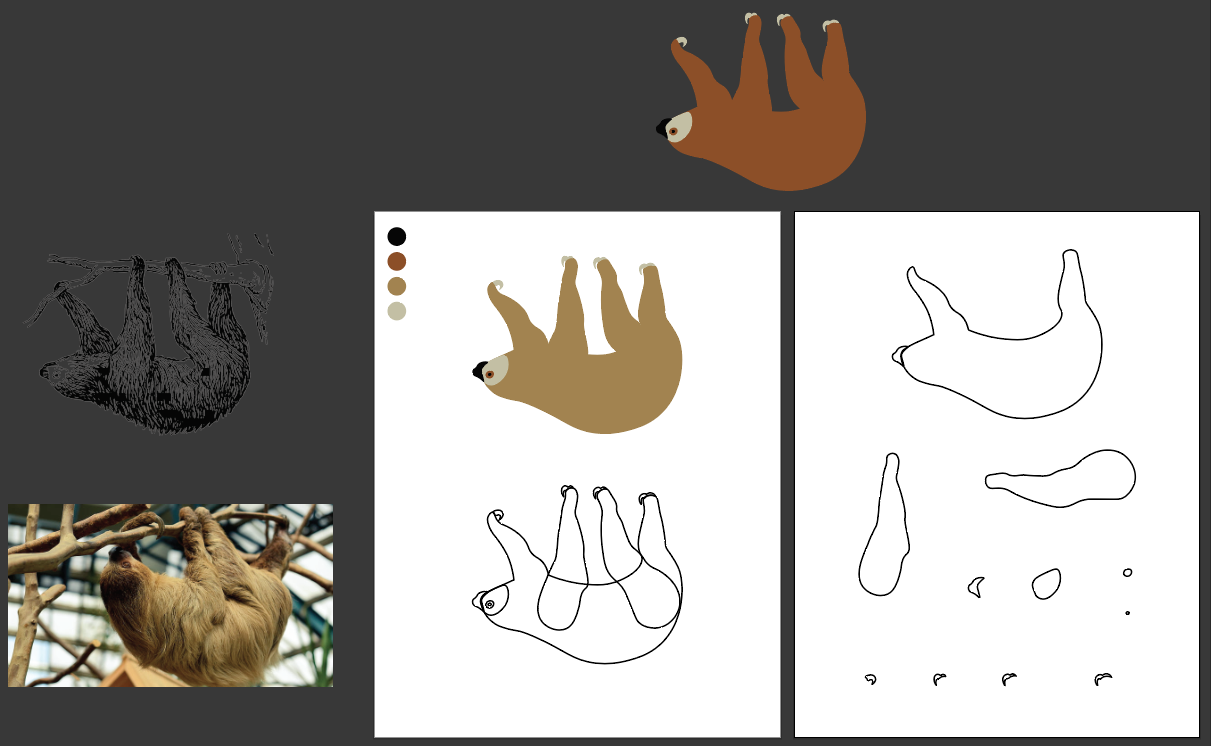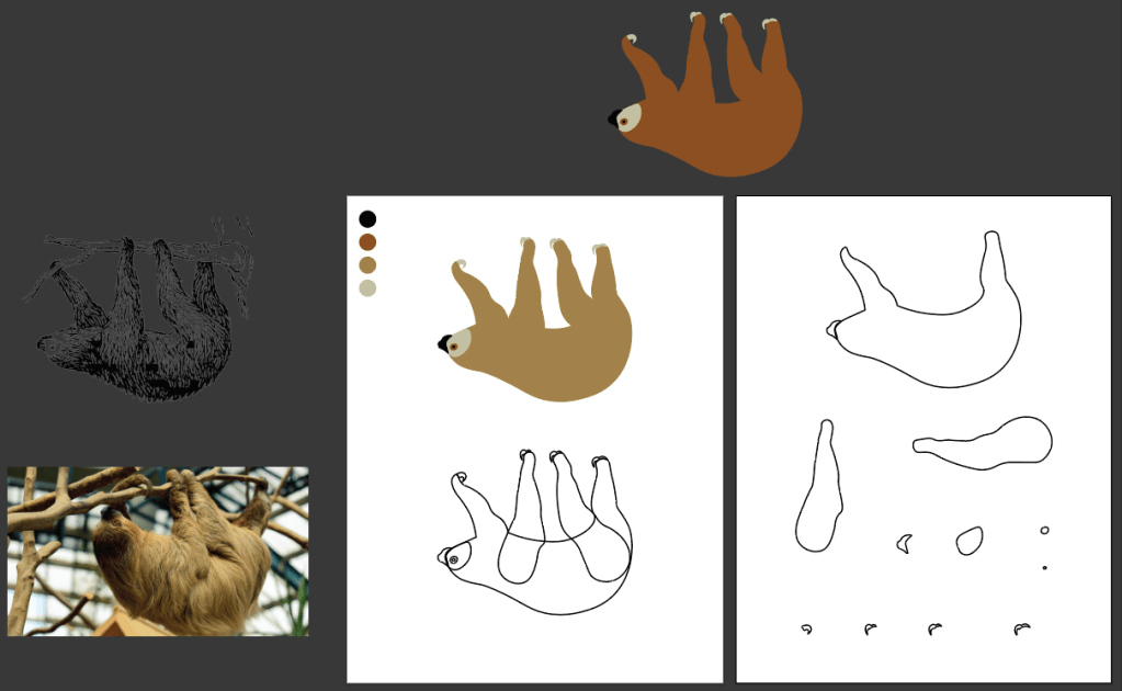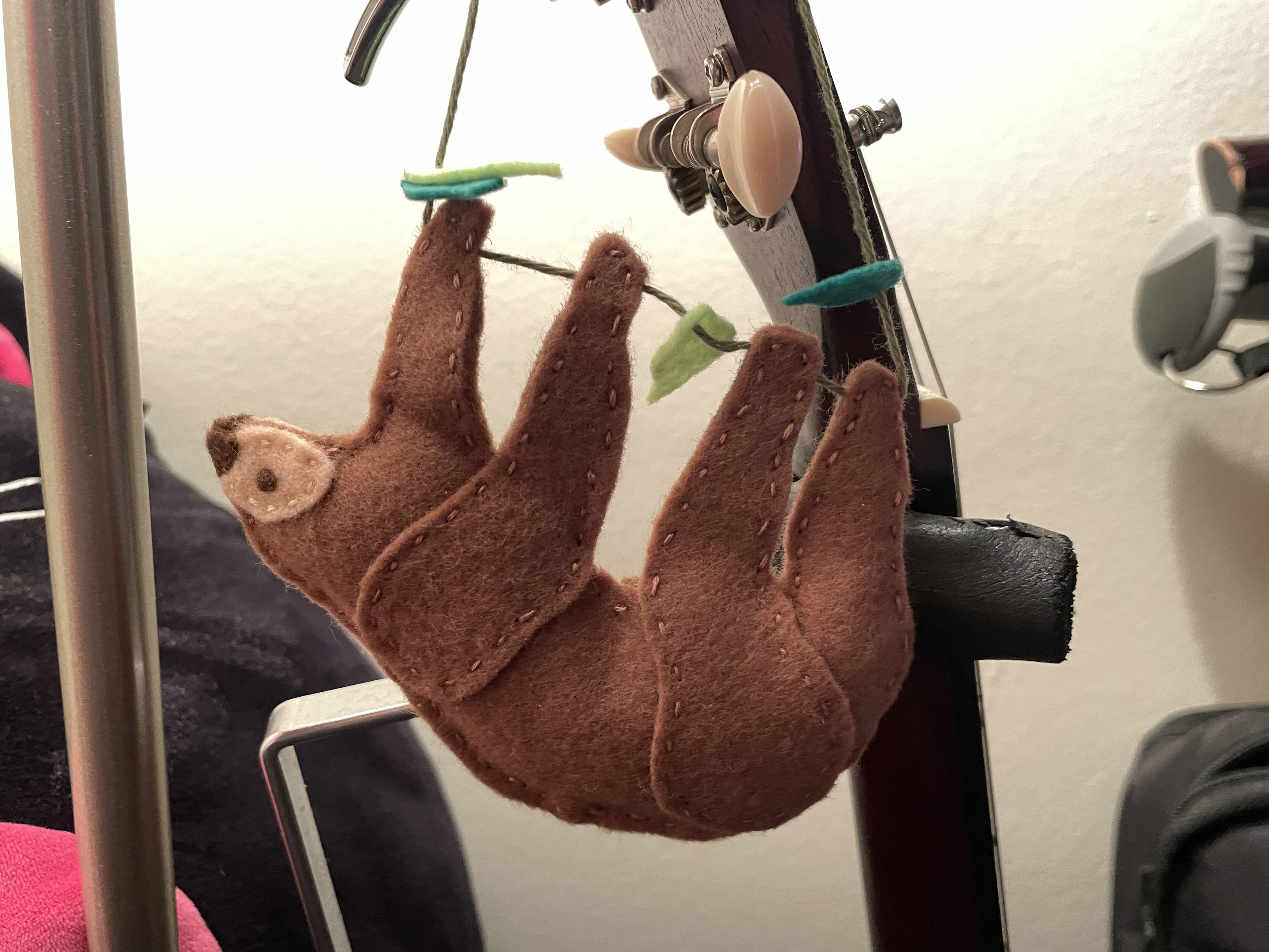 After the same initial design process, I realized that some of the smaller parts would be impossible to cut from felt with my clunky scissors. So I went back and streamlined the design. The result was both easier to make and – I think – cuter. I added some felt leaves as decoration, and voilà! A sloth on a vine.